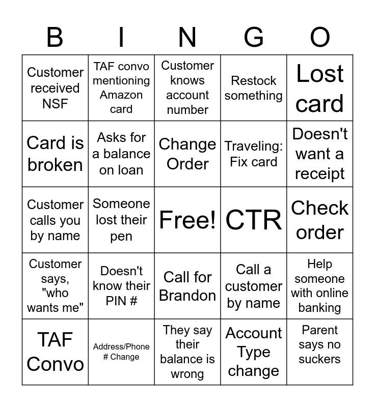 This bingo card has a free space and 24 words: Doesn't know their PIN #, Address/Phone # Change, Change Order, TAF Convo, Lost card, Customer received NSF, Card is broken, TAF convo mentioning Amazon card, CTR, Call for Brandon, Traveling: Fix card, Customer calls you by name, Call a customer by name, Help someone with online banking, Asks for a balance on loan, Account Type change, Check order, Customer knows account number, Doesn't want a receipt, Someone lost their pen, Parent says no suckers, Customer says, "who wants me", Restock something and They say their balance is wrong.