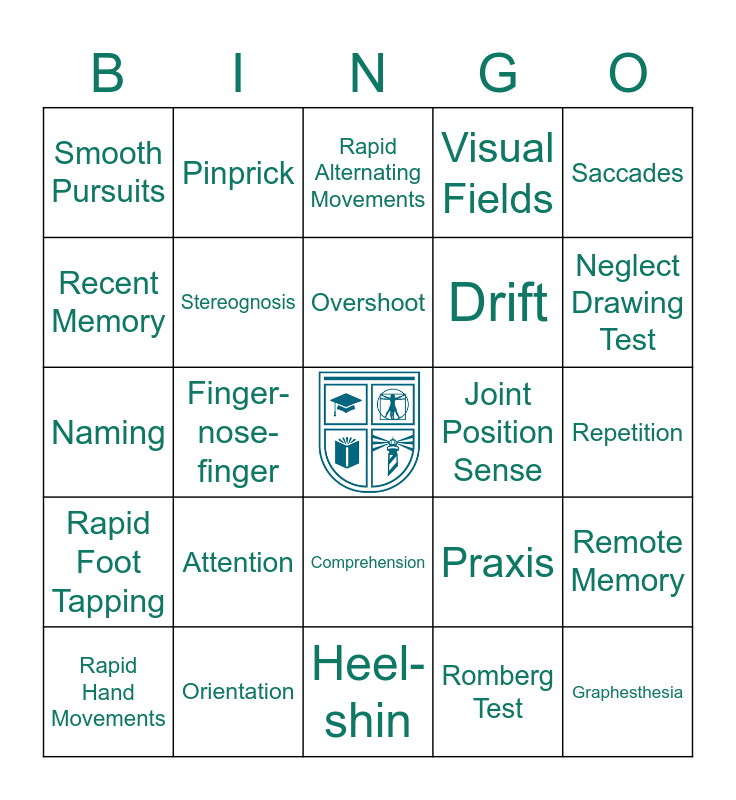 This bingo card has a free space and 25 words: Attention, Heel-shin, Overshoot, Rapid Hand Movements, Saccades, Smooth Pursuits, Recent Memory, Pinprick, Joint Position Sense, Comprehension, Drift, Naming, Praxis, Remote Memory, Stereognosis, Tactile Extinction, Repetition, Rapid Alternating Movements, Neglect Drawing Test, Finger-nose-finger, Graphesthesia, Orientation, Rapid Foot Tapping, Visual Fields and Romberg Test.