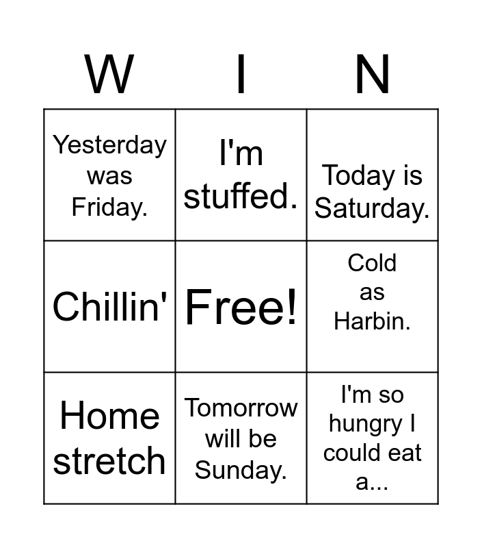 This bingo card has a free space and 11 words: Howdy, Hot as a volcano., Cold as Harbin., Home stretch, Today is Saturday., Yesterday was Friday., Tomorrow will be Sunday., Until next time., Chillin', I'm stuffed. and I'm so hungry I could eat a....