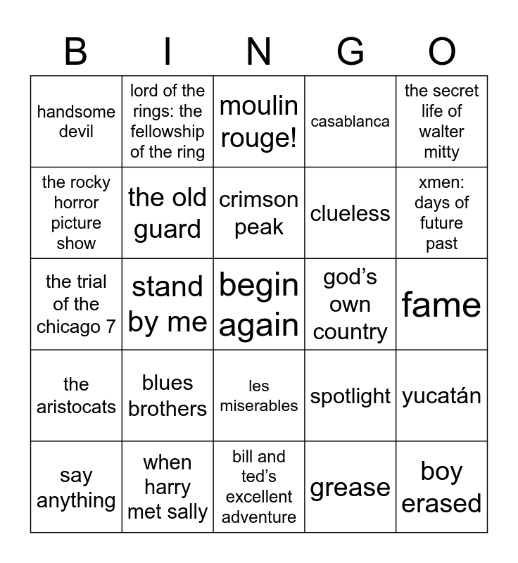 This bingo card has 35 words: the breakfast club, pride and prejudice (2005), pride!, the old guard, les miserables, casablanca, the rocky horror picture show, i saw the light, crimson peak, the outsiders, the trial of the chicago 7, the secret life of walter mitty, st. elmo’s fire, the duchess, handsome devil, god’s own country, grease, stand by me, the aristocats, begin again, spotlight, say anything, yucatán, when harry met sally, moulin rouge!, xmen: days of future past, boy erased, downton abbey, clueless, fame, a million ways to die in the west, bill and ted’s excellent adventure, blues brothers, lord of the rings: the fellowship of the ring and to kill a mockingbird.