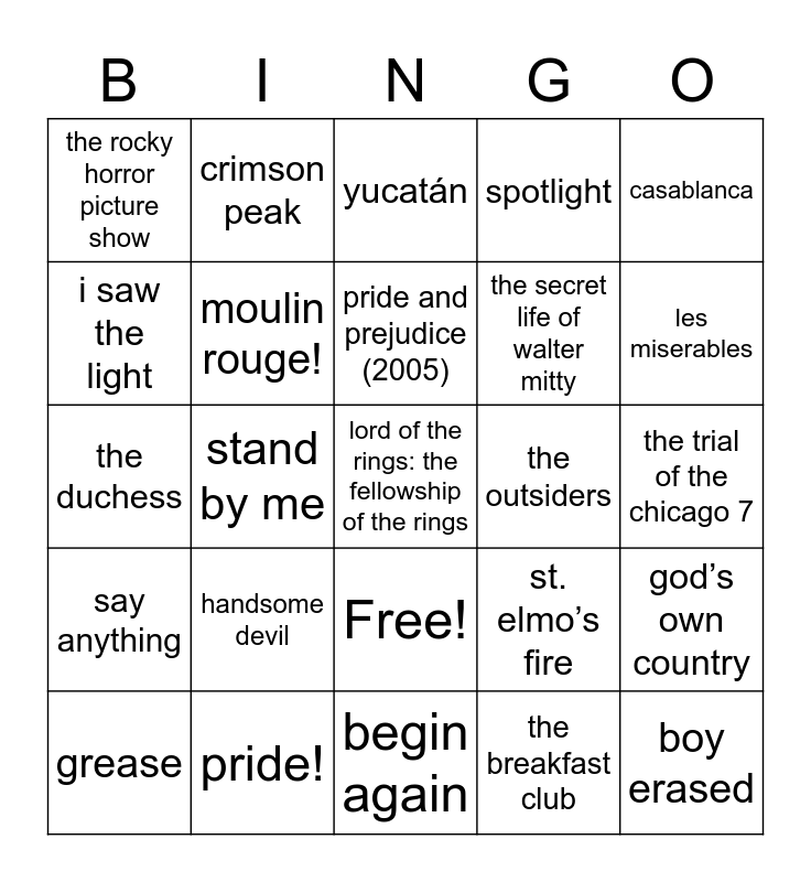 This bingo card has 26 words: Free!, the breakfast club, pride and prejudice (2005), pride!, casablanca, the rocky horror picture show, i saw the light, crimson peak, the trial of the chicago 7, st. elmo’s fire, the secret life of walter mitty, the duchess, god’s own country, grease, stand by me, the aristocats, spotlight, say anything, yucatán, lord of the rings: the fellowship of the rings, les miserables, begin again, the outsiders, handsome devil, moulin rouge! and boy erased.