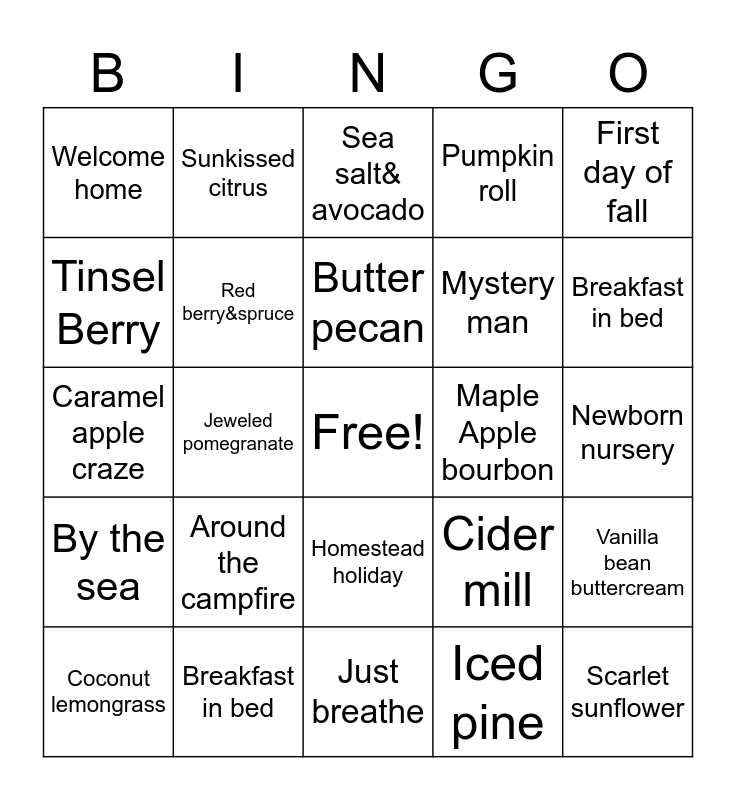 This bingo card has a free space and 24 words: Around the campfire, Breakfast in bed, Butter pecan, Coconut lemongrass, First day of fall, Welcome home, Tinsel Berry, Sunkissed citrus, Maple Apple bourbon, Homestead holiday, Mystery man, Caramel apple craze, Cider mill, Vanilla bean buttercream, Red berry&spruce, Iced pine, Newborn nursery, Sea salt& avocado, Breakfast in bed, Jeweled pomegranate, Scarlet sunflower, By the sea, Pumpkin roll and Just breathe.