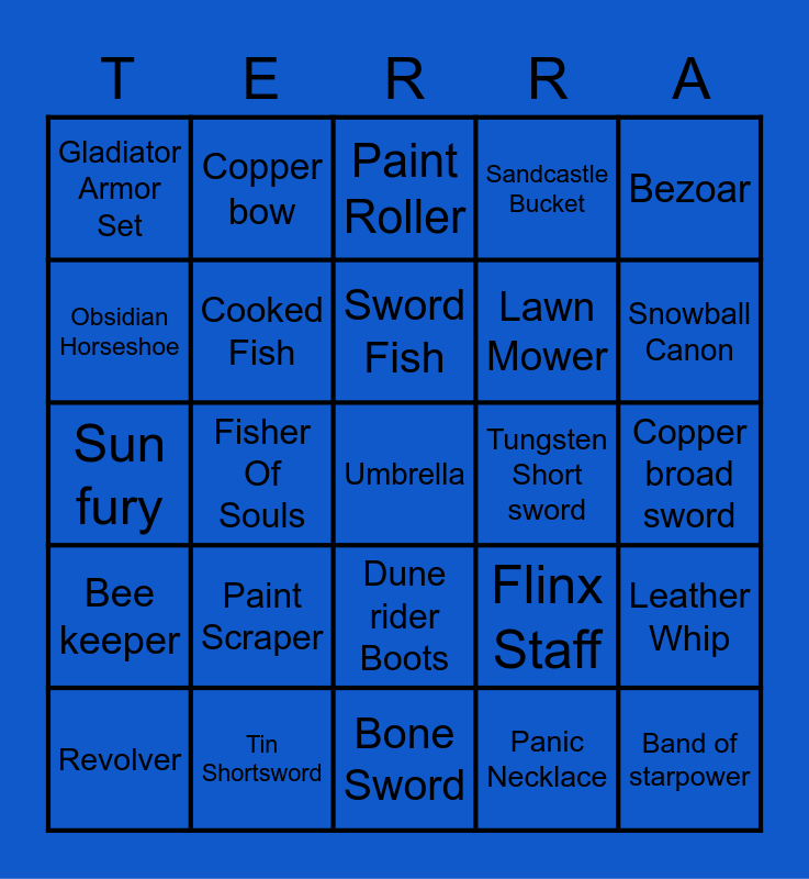 This bingo card has 25 words: Paint Scraper, Bone Sword, Sword Fish, Revolver, Bezoar, Gladiator Armor Set, Obsidian Horseshoe, Copper bow, Tungsten Short sword, Dune rider Boots, Lawn Mower, Sun fury, Flinx Staff, Leather Whip, Cooked Fish, Band of starpower, Copper broad sword, Paint Roller, Snowball Canon, Fisher Of Souls, Umbrella, Tin Shortsword, Bee keeper, Sandcastle Bucket and Panic Necklace.