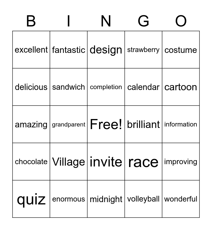 This bingo card has a free space and 24 words: Village, enormous, completion, quiz, costume, excellent, delicious, fantastic, brilliant, invite, calendar, amazing, race, improving, sandwich, volleyball, information, design, cartoon, grandparent, wonderful, chocolate, strawberry and midnight.