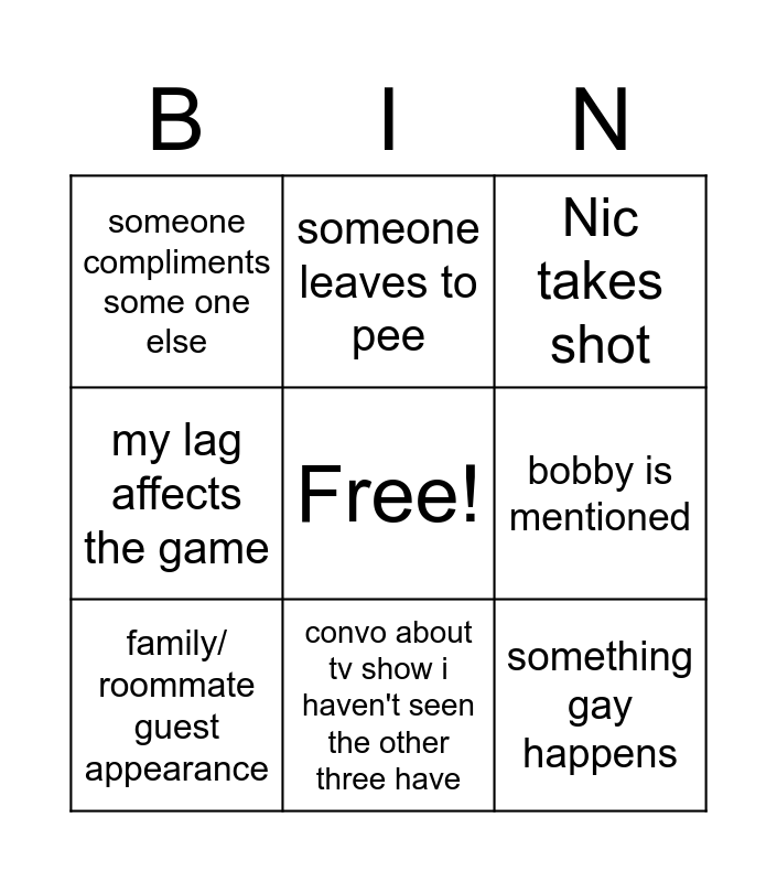 This bingo card has a free space and 8 words: bobby is mentioned, Nic takes shot, someone leaves to pee, family/ roommate guest appearance, someone compliments some one else, something gay happens, my lag affects the game and convo about tv show i haven't seen the other three have.