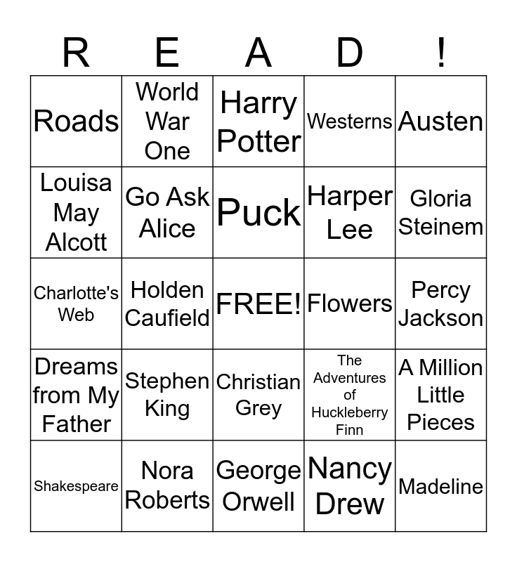 This bingo card has a free space and 24 words: Stephen King, Nora Roberts, Puck, Shakespeare, Austen, Roads, Louisa May Alcott, World War One, Flowers, Christian Grey, Harper Lee, Charlotte's Web, The Adventures of Huckleberry Finn, A Million Little Pieces, Go Ask Alice, Nancy Drew, Percy Jackson, Harry Potter, Gloria Steinem, Holden Caufield, Madeline, Dreams from My Father, Westerns and George Orwell.