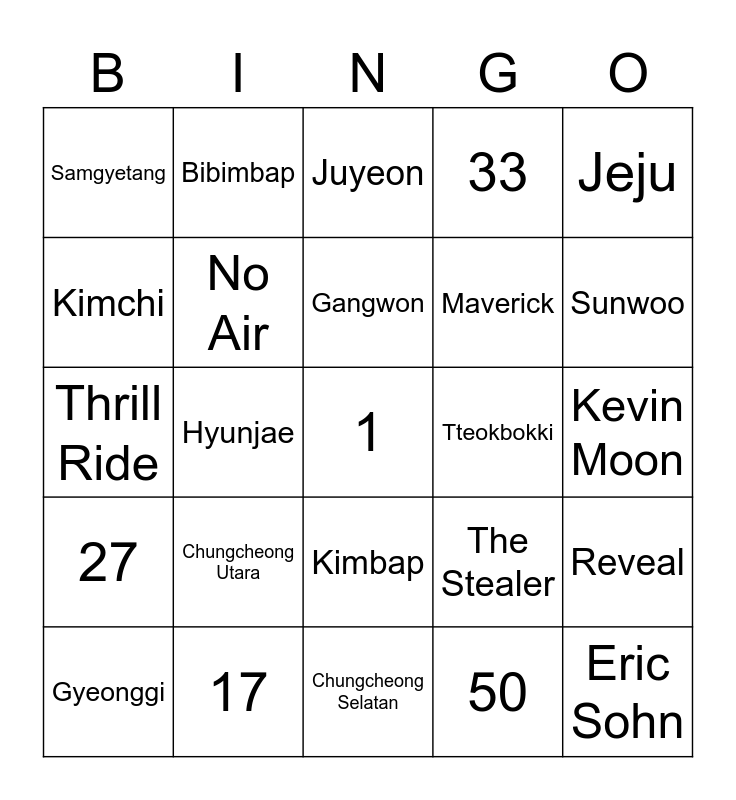 This bingo card has 25 words: Chungcheong Utara, Chungcheong Selatan, Gangwon, Gyeonggi, Jeju, Samgyetang, Kimchi, Bibimbap, Tteokbokki, Kimbap, Maverick, Thrill Ride, The Stealer, Reveal, No Air, Eric Sohn, Kevin Moon, Juyeon, Sunwoo, Hyunjae, 1, 17, 27, 33 and 50.