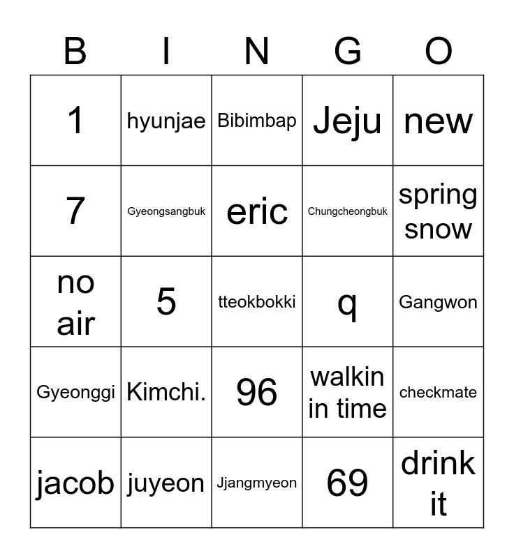 This bingo card has a free space and 24 words: Kimchi., juyeon, eric, jacob, new, 1, 7, hyunjae, q, 96, Chungcheongbuk, no air, walkin in time, checkmate, Gyeongsangbuk, 69, Gangwon, Bibimbap, spring snow, 5, drink it, Gyeonggi, Jeju and Jjangmyeon.