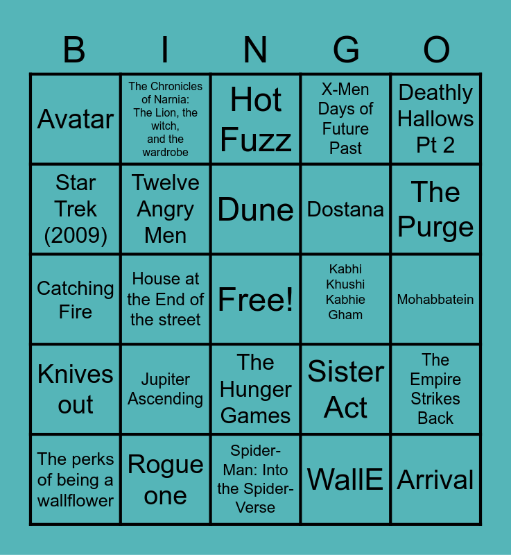 This bingo card has a free space and 24 words: Jupiter Ascending, Rogue one, Dune, The perks of being a wallflower, Deathly Hallows Pt 2, Avatar, Star Trek (2009), The Chronicles of Narnia: The Lion, the witch, and the wardrobe, Kabhi Khushi Kabhie Gham, The Hunger Games, Dostana, Catching Fire, Sister Act, The Empire Strikes Back, Twelve Angry Men, WallE, Mohabbatein, Hot Fuzz, The Purge, House at the End of the street, Arrival, Knives out, X-Men Days of Future Past and Spider-Man: Into the Spider-Verse.