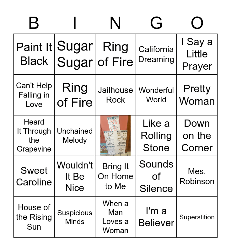 This bingo card has a free space and 39 words: Son of a Preacher Man, I Got You Babe, Stand By Me, Ring of Fire, House of the Rising Sun, Bring It On Home to Me, Jailhouse Rock, Happy Together, I Say a Little Prayer, Sweet Caroline, Unchained Melody, California Dreaming, Superstition, Down on the Corner, Like a Rolling Stone, Wouldn't It Be Nice, Dock of the Bay, Paint It Black, Higher and Higher, Sounds of Silence, Can't Help Falling in Love, When a Man Loves a Woman, Wonderful World, Pretty Woman, Be My Baby, Here Comes the Sun, Brown Eyed Girl, Re- spect, Good Vibrations, Sugar Sugar, Say a Little Prayer, I Want to Hold Your Hand, Ring of Fire, Suspicious Minds, I'm a Believer, Gimme Shelter, Mes. Robinson, Heard It Through the Grapevine and Stand By Me.