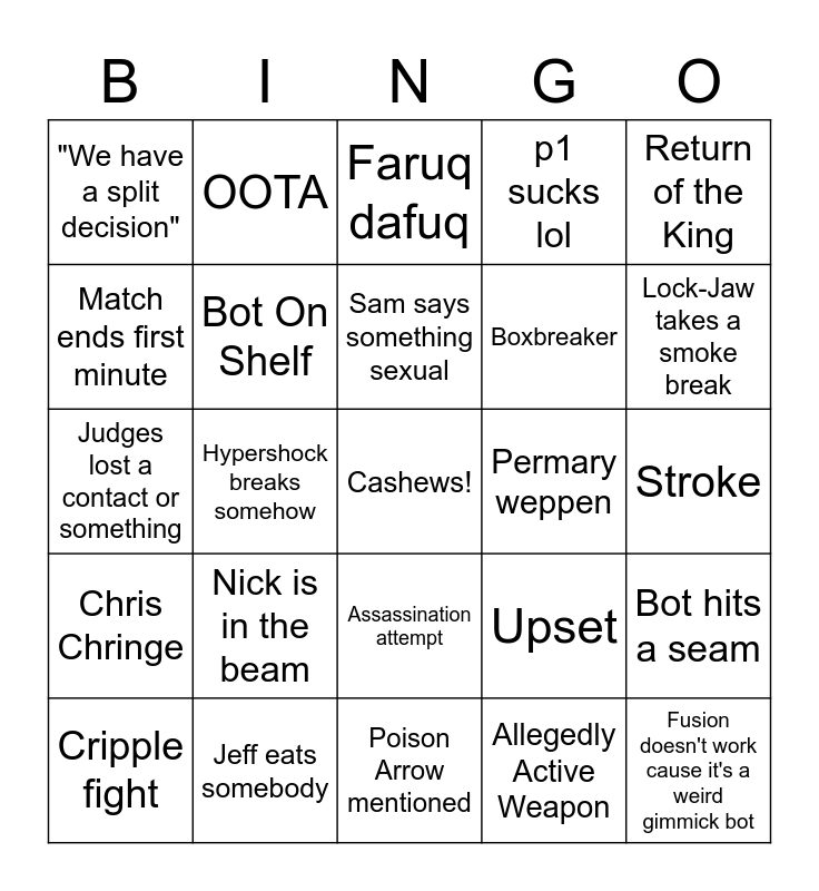 This bingo card has a free space and 24 words: Nick is in the beam, Jeff eats somebody, Sam says something sexual, Cripple fight, Return of the King, "We have a split decision", Match ends first minute, OOTA, Permary weppen, Assassination attempt, Boxbreaker, Judges lost a contact or something, Upset, Bot hits a seam, Bot On Shelf, Allegedly Active Weapon, Stroke, Faruq dafuq, Lock-Jaw takes a smoke break, Hypershock breaks somehow, Fusion doesn't work cause it's a weird gimmick bot, Chris Chringe, p1 sucks lol and Poison Arrow mentioned.