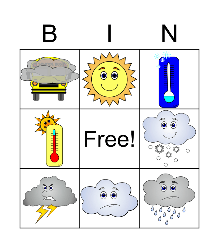 This bingo card has 9 images, a free space and 1 words: The weather.