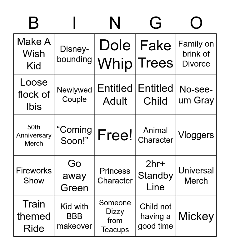 This bingo card has a free space and 24 words: Go away Green, Kid with BBB makeover, Entitled Adult, Train themed Ride, Family on brink of Divorce, Make A Wish Kid, Loose flock of Ibis, Disney- bounding, Animal Character, Princess Character, Entitled Child, 50th Anniversary Merch, 2hr+ Standby Line, Universal Merch, Newlywed Couple, Child not having a good time, Vloggers, Dole Whip, No-see-um Gray, “Coming Soon!”, Mickey, Fireworks Show, Fake Trees and Someone Dizzy from Teacups.