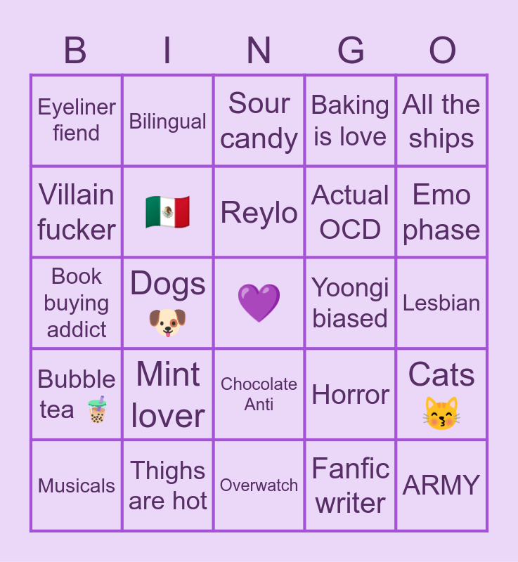 This bingo card has a free space and 24 words: Mint lover, Thighs are hot, Reylo, Musicals, All the ships, Eyeliner fiend, Villain fucker, Bilingual, Yoongi biased, Chocolate Anti, Actual OCD, Book buying addict, Horror, Cats 😽, 🇲🇽, Fanfic writer, Lesbian, Sour candy, Emo phase, Dogs 🐶, ARMY, Bubble tea 🧋, Baking is love and Overwatch.
