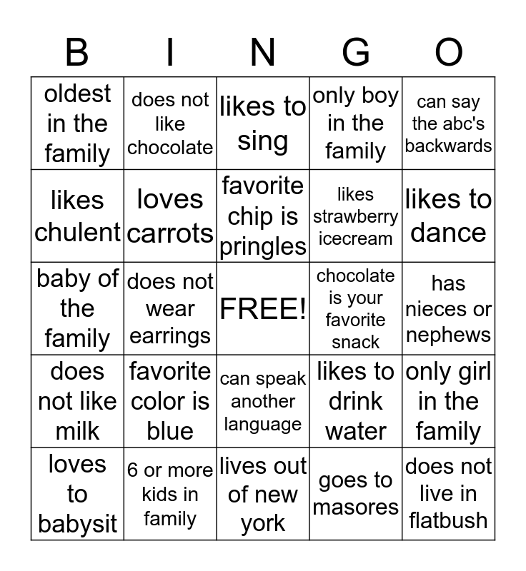 This bingo card has a free space and 24 words: favorite color is blue, 6 or more kids in family, favorite chip is pringles, loves to babysit, can say the abc's backwards, oldest in the family, likes chulent, does not like chocolate, chocolate is your favorite snack, can speak another language, likes strawberry icecream, baby of the family, likes to drink water, only girl in the family, loves carrots, goes to masores, has nieces or nephews, likes to sing, likes to dance, does not wear earrings, does not live in flatbush, does not like milk, only boy in the family and lives out of new york.