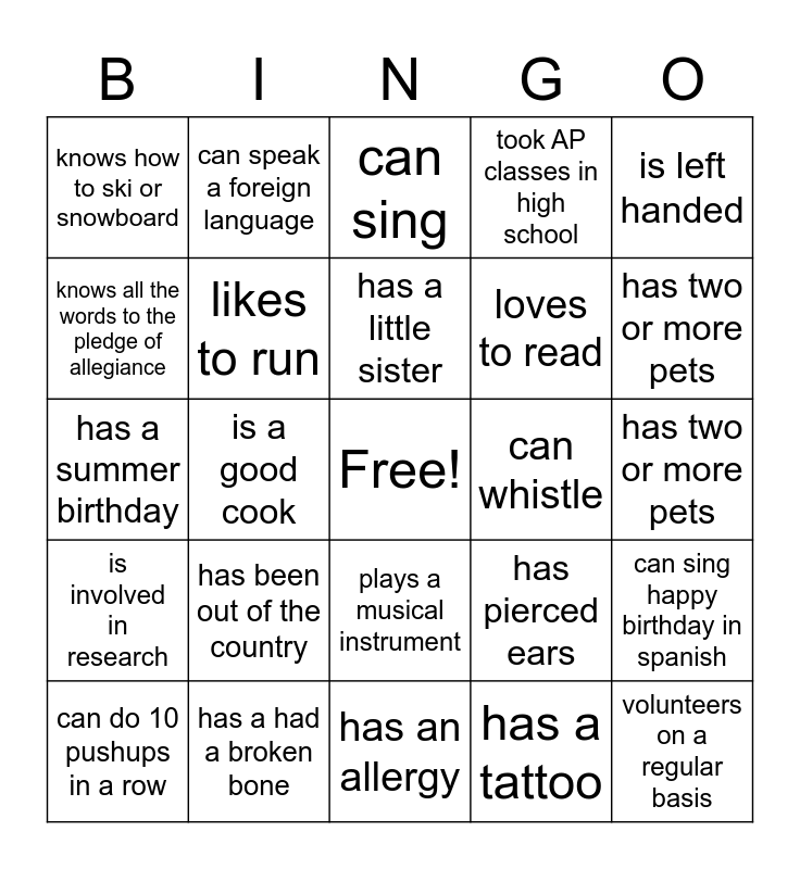 This bingo card has a free space and 24 words: has been out of the country, has a had a broken bone, has a little sister, can do 10 pushups in a row, is left handed, knows how to ski or snowboard, knows all the words to the pledge of allegiance, can speak a foreign language, can whistle, plays a musical instrument, loves to read, has a summer birthday, has pierced ears, can sing happy birthday in spanish, likes to run, has a tattoo, has two or more pets, can sing, has two or more pets, is a good cook, volunteers on a regular basis, is involved in research, took AP classes in high school and has an allergy.