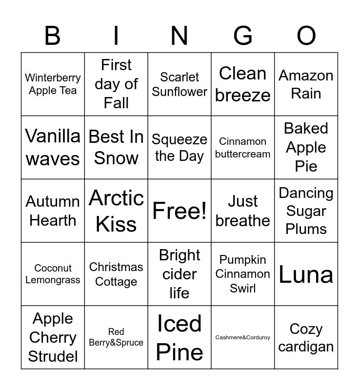 This bingo card has a free space and 24 words: Christmas Cottage, Red Berry&Spruce, Squeeze the Day, Apple Cherry Strudel, Amazon Rain, Winterberry Apple Tea, Vanilla waves, First day of Fall, Just breathe, Bright cider life, Cinnamon buttercream, Autumn Hearth, Pumpkin Cinnamon Swirl, Luna, Best In Snow, Cashmere&Corduroy, Dancing Sugar Plums, Scarlet Sunflower, Baked Apple Pie, Arctic Kiss, Cozy cardigan, Coconut Lemongrass, Clean breeze and Iced Pine.