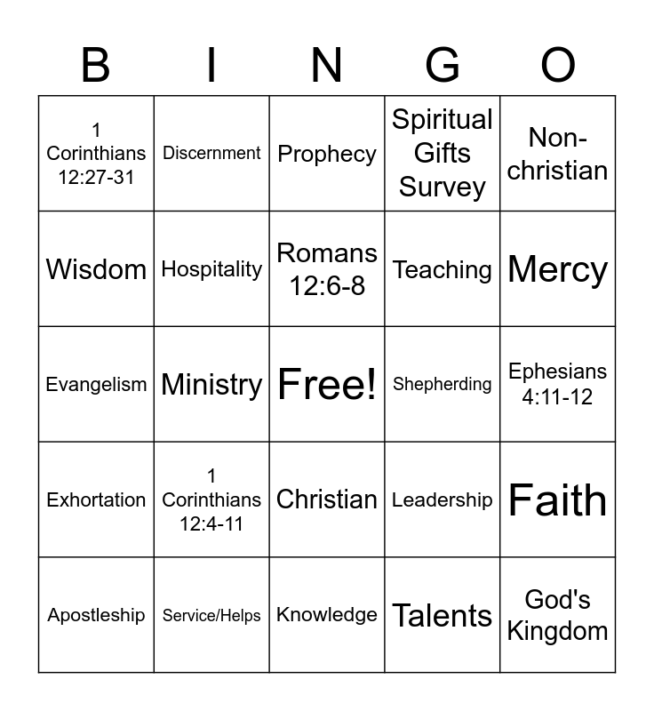 This bingo card has a free space and 27 words: Leadership, Administration, Teaching, Knowledge, Wisdom, Prophecy, Discernment, Exhortation, Shepherding, Faith, Evangelism, Spiritual Gifts Survey, Apostleship, Service/Helps, Mercy, Giving, Hospitality, Romans 12:6-8, 1 Corinthians 12:4-11, 1 Corinthians 12:27-31, Ephesians 4:11-12, Talents, Ministry, God's Kingdom, Christian, Non-christian and New Testament.