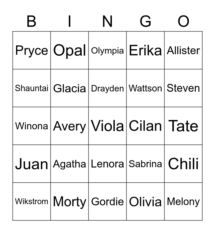 This bingo card has 25 words: Agatha, Gordie, Drayden, Wikstrom, Allister, Pryce, Shauntai, Opal, Cilan, Lenora, Wattson, Winona, Sabrina, Chili, Glacia, Melony, Tate, Olympia, Steven, Avery, Viola, Morty, Juan, Erika and Olivia.