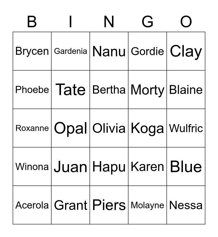 This bingo card has 25 words: Juan, Piers, Bertha, Acerola, Clay, Brycen, Phoebe, Gardenia, Koga, Hapu, Morty, Roxanne, Karen, Blue, Tate, Nessa, Wulfric, Nanu, Blaine, Opal, Olivia, Grant, Winona, Gordie and Molayne.