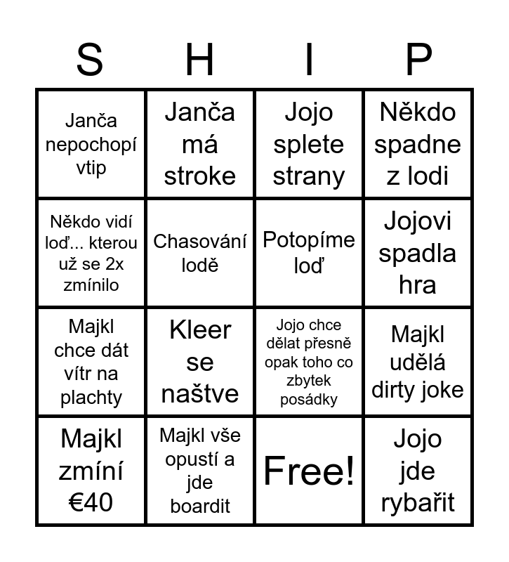 This bingo card has 17 words: Free!, Majkl zmíní €40, Jojo splete strany, Janča nepochopí vtip, Kleer se naštve, Někdo spadne z lodi, Majkl udělá dirty joke, Potopíme loď, Jojovi spadla hra, Chasování lodě, Majkl vše opustí a jde boardit, Jojo chce dělat přesně opak toho co zbytek posádky, Někdo vidí loď... kterou už se 2x zmínilo, Janča má stroke, Majkl chce dát vítr na plachty, Majkl splete jména and Jojo jde rybařit.