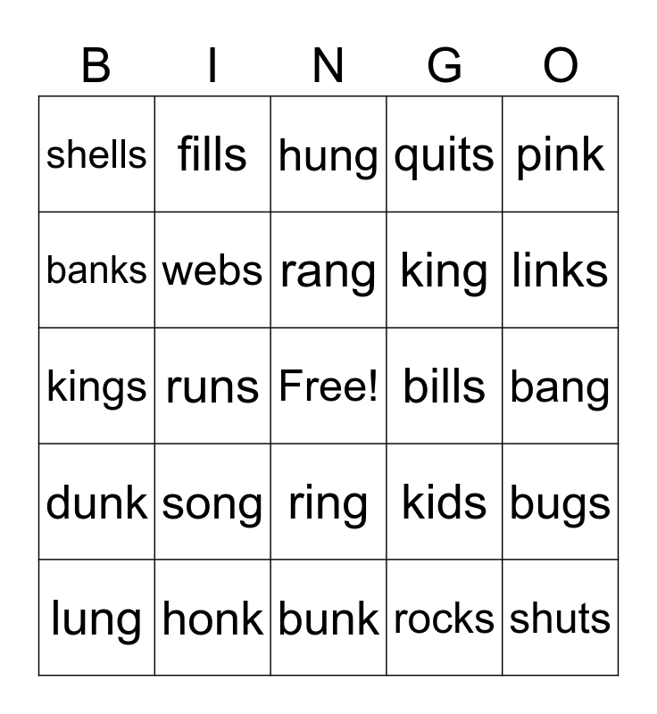 This bingo card has a free space and 54 words: packs, dunk, long, zags, ring, dogs, quits, chips, banks, locks, shells, yank, honk, lung, chills, bunk, shuts, king, thanks, bang, kids, gong, bills, pink, wink, fills, chunks, sheds, sips, rocks, sank, vans, thinks, wins, hung, pups, kings, bugs, rinks, webs, think, sets, sing, sunk, song, backs, tank, beds, rang, runs, links, dads, things and ships.
