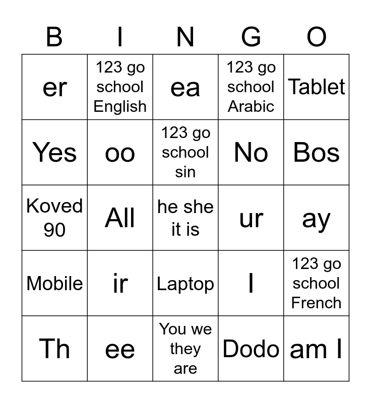 This bingo card has a free space and 29 words: Th, Sh, All, ng, er, ea, oo, ir, ur, ee, ay, am I, You we they are, Dodo, Bos, Lol, Laptop, Mobile, Tablet, Koved 90, I, You, No, Yes, 123 go school Arabic, 123 go school English, 123 go school French, 123 go school sin and 123 go school.