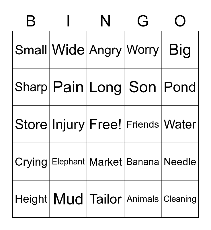This bingo card has a free space and 25 words: Elephant, Tailor, Long, Height, Big, Small, Sharp, Wide, Friends, Market, Son, Store, Banana, Needle, Pain, Reason, Water, Angry, Pond, Injury, Cleaning, Mud, Crying, Worry and Animals.