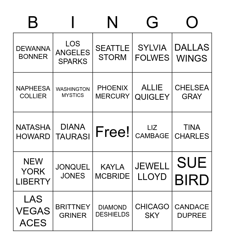 This bingo card has a free space and 34 words: ATLANTA DREAM, CHICAGO SKY, CONNECTICUT SUN, INDIANA FEVER, NEW YORK LIBERTY, WASHINGTON MYSTICS, DALLAS WINGS, LAS VEGAS ACES, LOS ANGELES SPARKS, MINNESOTA LYNX, PHOENIX MERCURY, SEATTLE STORM, ELENA DELLA DONNE, A'JA WILSON, LIZ CAMBAGE, CHELSEA GRAY, BRITTNEY GRINER, NATASHA HOWARD, JONQUEL JONES, JEWELL LLOYD, KAYLA MCBRIDE, KIA NURSE, DEWANNA BONNER, TINA CHARLES, DIAMOND DESHIELDS, CANDACE DUPREE, SYLVIA FOLWES, NNEKE OGWUMIKE, ALLIE QUIGLEY, NAPHEESA COLLIER, ODYSSEY SIMS, DIANA TAURASI, SUE BIRD and ALYSSA THOMAS.