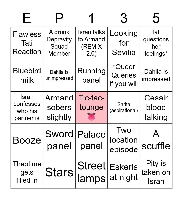This bingo card has a free space and 24 words: Sword panel, Stars, Running panel, Theotime gets filled in, Tati questions her feelings*, Flawless Tati Reaction, Bluebird milk, A drunk Depravity Squad Member, Sarita (aspirational), Palace panel, *Queer Queries if you will, Isran confesses who his partner is, Two location episode, A scuffle, Dahlia is unimpressed, Eskeria at night, Cesair blood talking, Isran talks to Armand (REMIX 2.0), Dahlia is impressed, Armand sobers slightly, Pity is taken on Isran, Booze, Looking for Sevilia and Street lamps.