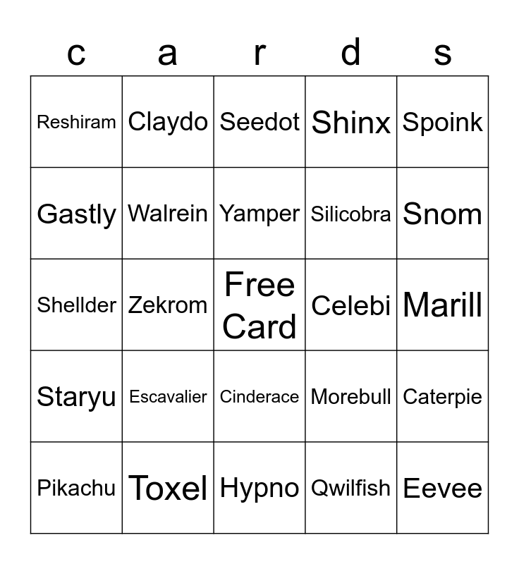 This bingo card has a free space and 49 words: Mew, Eevee, Ho-Oh, Hypno, Escavalier, Oricorio, Claydo, Onix, Gastly, Skitty, Walrein, Shinx, Caterpie, Morebull, Flaaffy, Sobble, Yamper, Celebi, Cosmog, Spoink, Zekrom, Qwilfish, Reshiram, Silicobra, Rockruff, Snom, Pikachu, Marowak, Cinderace, Staryu, Lugia, Scorbunny, Tapu Fini, Garchomp, Toxel, Litwick, Lapras, Inkay, Marill, Klefki, Dubwool, Lunala, Croconaw, jigglypuff, Shellder, Seedot, Hitmontop, Wooloo and Emolga.