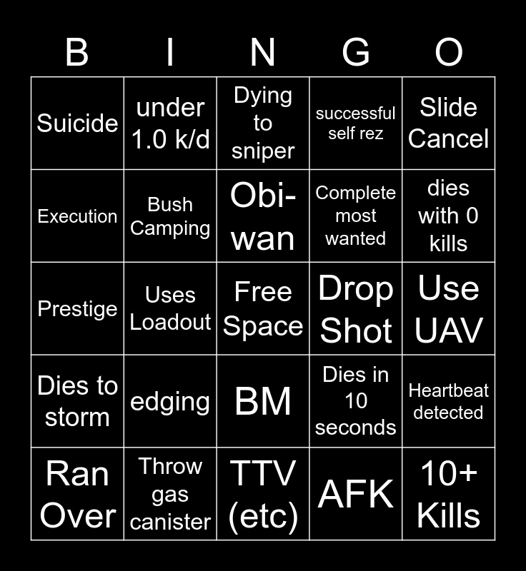 This bingo card has a free space and 24 words: edging, Throw gas canister, Obi-wan, Ran Over, Slide Cancel, Suicide, Execution, under 1.0 k/d, Drop Shot, BM, Complete most wanted, Prestige, Dies in 10 seconds, Heartbeat detected, Bush Camping, AFK, Use UAV, Dying to sniper, dies with 0 kills, Uses Loadout, 10+ Kills, Dies to storm, successful self rez and TTV (etc).