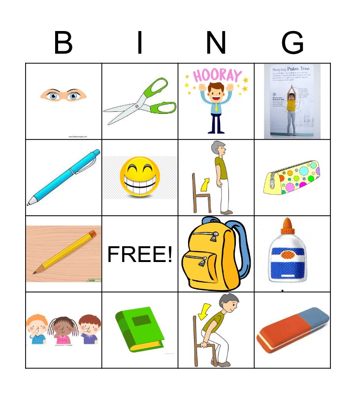 This bingo card has 15 images and 1 words: FREE!.