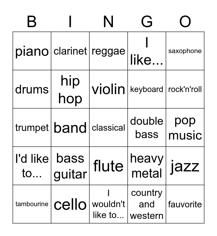 This bingo card has a free space and 24 words: bass guitar, cello, violin, tambourine, saxophone, piano, drums, clarinet, double bass, flute, keyboard, trumpet, heavy metal, jazz, hip hop, country and western, pop music, reggae, rock'n'roll, band, fauvorite, I'd like to..., I like... and I wouldn't like to....