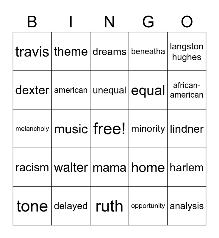 This bingo card has a free space and 24 words: walter, delayed, unequal, tone, langston hughes, travis, dexter, theme, minority, mama, equal, melancholy, home, harlem, american, opportunity, lindner, dreams, african-american, music, analysis, racism, beneatha and ruth.
