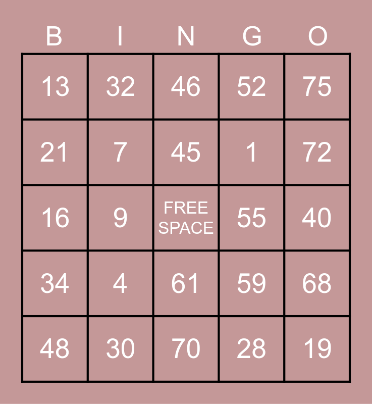 This bingo card has a free space and 24 words: 4, 30, 45, 48, 75, 13, 21, 32, 55, 61, 1, 16, 59, 68, 7, 28, 40, 46, 72, 9, 19, 34, 52 and 70.