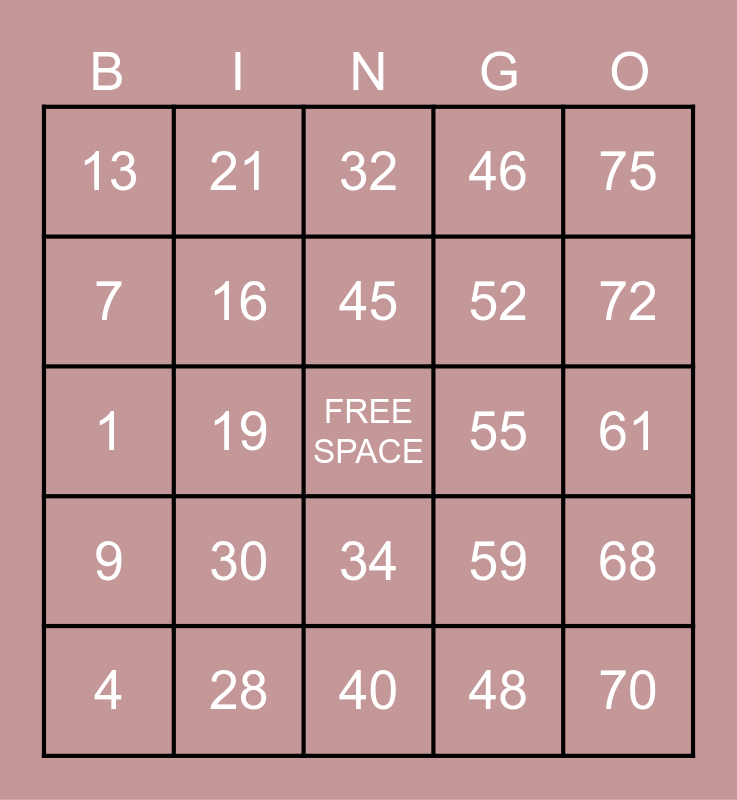 This bingo card has a free space and 24 words: 4, 30, 45, 48, 75, 13, 21, 32, 55, 61, 1, 16, 59, 68, 7, 28, 40, 46, 72, 9, 19, 34, 52 and 70.