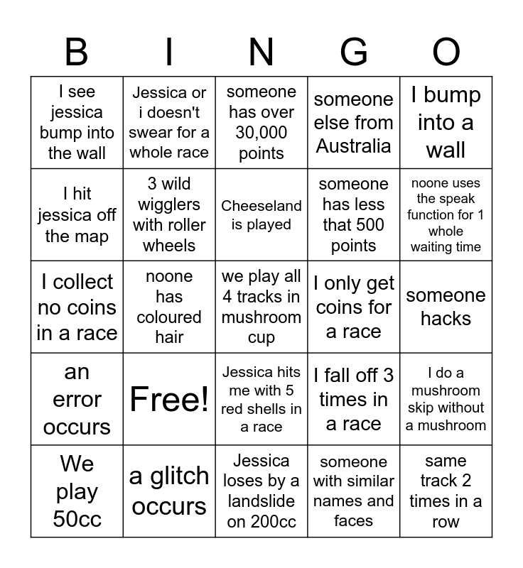 This bingo card has 25 words: Free!, Jessica loses by a landslide on 200cc, Cheeseland is played, We play 50cc, I bump into a wall, I see jessica bump into the wall, I hit jessica off the map, Jessica or i doesn't swear for a whole race, I only get coins for a race, Jessica hits me with 5 red shells in a race, someone has less that 500 points, I collect no coins in a race, I fall off 3 times in a race, I do a mushroom skip without a mushroom, 3 wild wigglers with roller wheels, same track 2 times in a row, someone hacks, someone has over 30,000 points, noone uses the speak function for 1 whole waiting time, noone has coloured hair, we play all 4 tracks in mushroom cup, a glitch occurs, an error occurs, someone else from Australia and someone with similar names and faces.