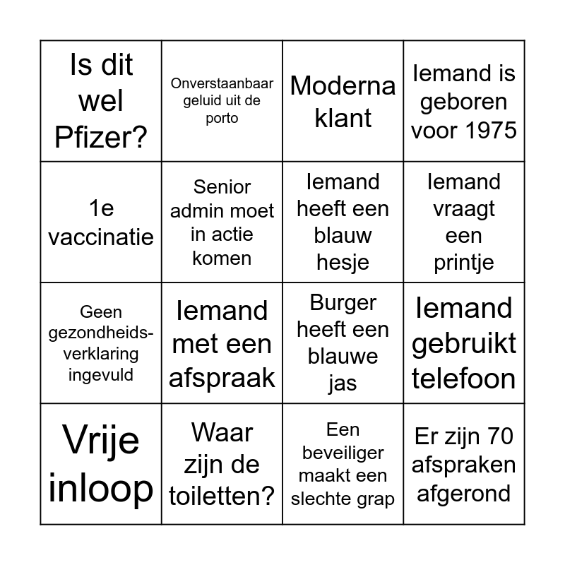 This bingo card has 20 words: Iemand gebruikt telefoon, 18 min komt voor een booster, Moderna klant, Pfizer klant, Vrije inloop, 1e vaccinatie, Waar zijn de toiletten?, Is dit wel Pfizer?, Geen gezondheids-verklaring ingevuld, Onverstaanbaar geluid uit de porto, Iemand met een afspraak, Burger heeft een blauwe jas, Senior admin moet in actie komen, Er zijn 70 afspraken afgerond, Iemand heeft een blauw hesje, De arts loopt over de vloer, Iemand vraagt een printje, Iemand is geboren voor 1975, Een beveiliger maakt een slechte grap and EHBO'er is nodig.