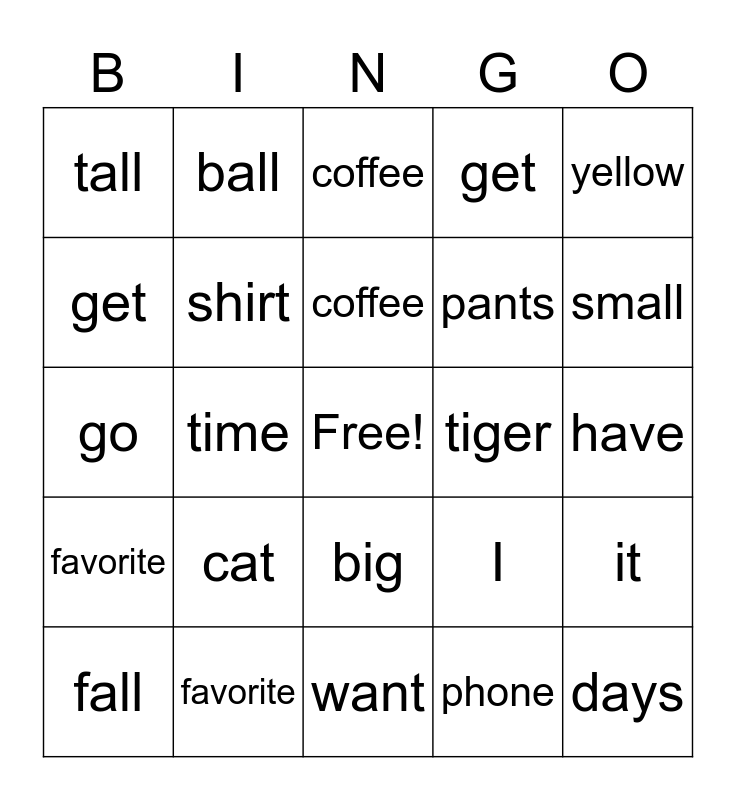 This bingo card has a free space and 24 words: cat, favorite, coffee, fall, yellow, tall, get, ball, tiger, big, pants, go, I, it, shirt, phone, have, coffee, small, time, days, favorite, get and want.