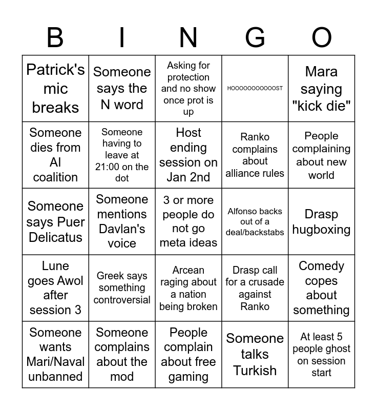 This bingo card has 28 words: Comedy copes about something, Someone says Fryslân boppe, Ranko complains about alliance rules, Someone talks Turkish, Someone dies from AI coalition, Asking for protection and no show once prot is up, Someone says the N word, Lune goes Awol after session 3, Alfonso backs out of a deal/backstabs, Someone wants Mari/Naval unbanned, Someone says Puer Delicatus, HOOOOOOOOOOOST, Someone complains about the mod, People complain about free gaming, People complaining about new world, Fox and Burnsten ally, Greek says something controversial, Someone having to leave at 21:00 on the dot, Host ending session on Jan 2nd, Arcean raging about a nation being broken, Patrick's mic breaks, At least 5 people ghost on session start, 3 or more people do not go meta ideas, Someone mentions Davlan's voice, Drasp hugboxing, Drasp call for a crusade against Ranko, Mara saying "kick die" and Julian saying he will sub and forget to show.