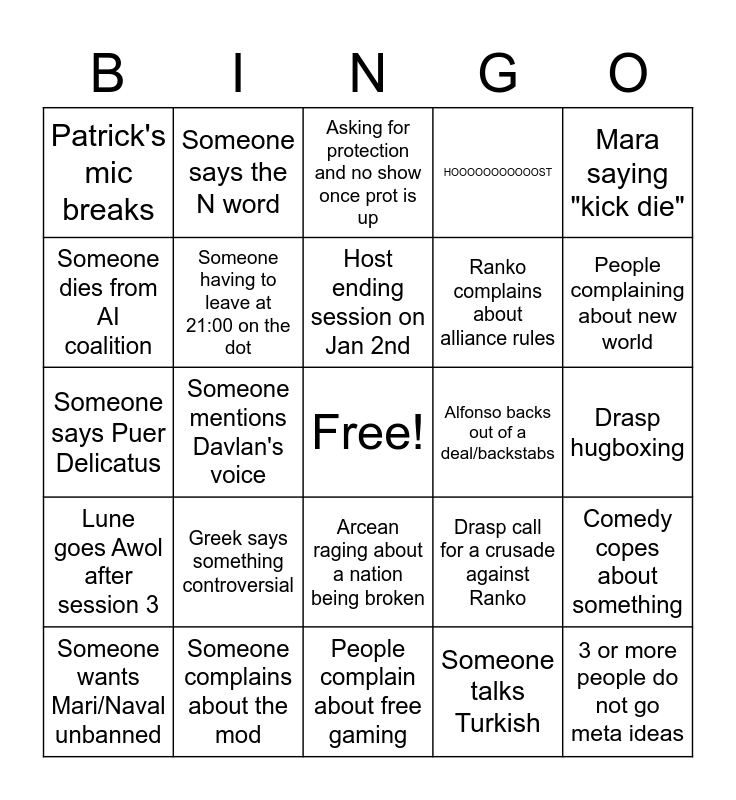 This bingo card has a free space and 28 words: Comedy copes about something, Someone says Fryslân boppe, Ranko complains about alliance rules, Someone talks Turkish, Someone dies from AI coalition, Asking for protection and no show once prot is up, Someone says the N word, Lune goes Awol after session 3, Alfonso backs out of a deal/backstabs, Someone wants Mari/Naval unbanned, Someone says Puer Delicatus, HOOOOOOOOOOOST, Someone complains about the mod, People complain about free gaming, People complaining about new world, Fox and Burnsten ally, Greek says something controversial, Someone having to leave at 21:00 on the dot, Host ending session on Jan 2nd, Arcean raging about a nation being broken, Patrick's mic breaks, At least 5 people ghost on session start, 3 or more people do not go meta ideas, Someone mentions Davlan's voice, Drasp hugboxing, Drasp call for a crusade against Ranko, Mara saying "kick die" and Julian saying he will sub and forget to show.