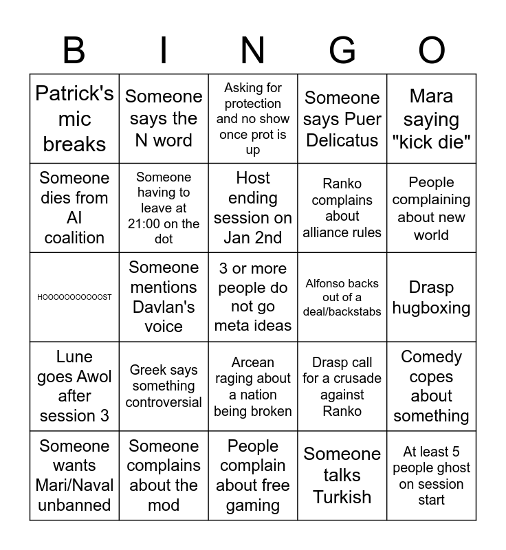 This bingo card has 28 words: Comedy copes about something, Someone says Fryslân boppe, Ranko complains about alliance rules, Someone talks Turkish, Someone dies from AI coalition, Asking for protection and no show once prot is up, Someone says the N word, Lune goes Awol after session 3, Alfonso backs out of a deal/backstabs, Someone wants Mari/Naval unbanned, HOOOOOOOOOOOST, Someone says Puer Delicatus, Someone complains about the mod, People complain about free gaming, People complaining about new world, Fox and Burnsten ally, Greek says something controversial, Someone having to leave at 21:00 on the dot, Host ending session on Jan 2nd, Arcean raging about a nation being broken, Patrick's mic breaks, At least 5 people ghost on session start, 3 or more people do not go meta ideas, Someone mentions Davlan's voice, Drasp hugboxing, Drasp call for a crusade against Ranko, Mara saying "kick die" and Julian saying he will sub and forget to show.