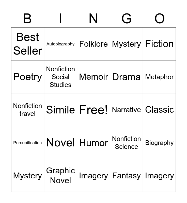 This bingo card has a free space and 24 words: Novel, Graphic Novel, Memoir, Mystery, Fiction, Best Seller, Poetry, Autobiography, Narrative, Humor, Drama, Nonfiction travel, Nonfiction Science, Biography, Nonfiction Social Studies, Fantasy, Classic, Folklore, Metaphor, Simile, Imagery, Personification, Mystery and Imagery.