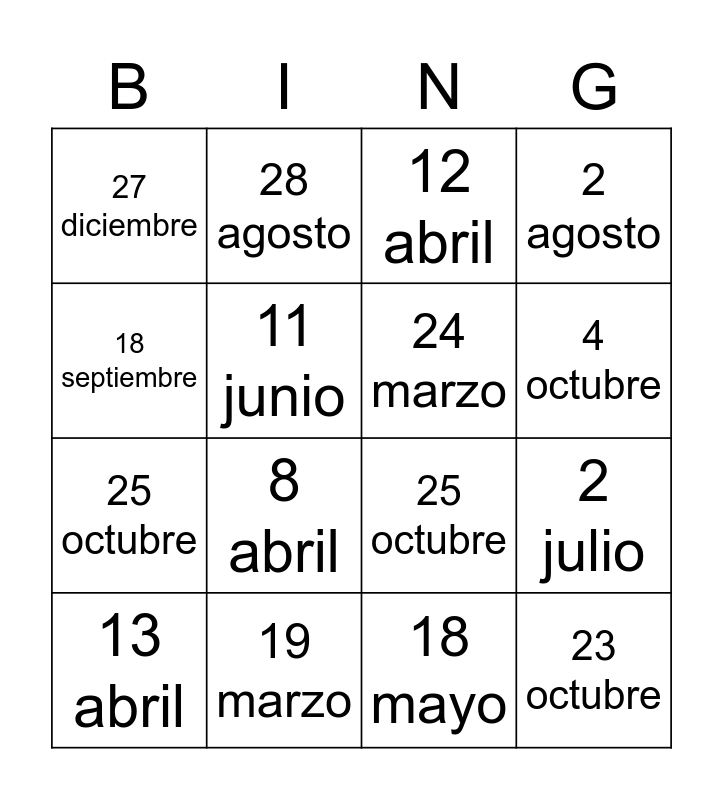 This bingo card has 20 words: 2 julio, 6 octubre, 12 abril, 10 marzo, 13 abril, 18 septiembre, 19 marzo, 27 diciembre, 25 octubre, 28 agosto, 8 abril, 25 octubre, 11 junio, 23 octubre, 24 marzo, 2 octubre, 4 octubre, 2 agosto, 18 mayo and 4 octubre.