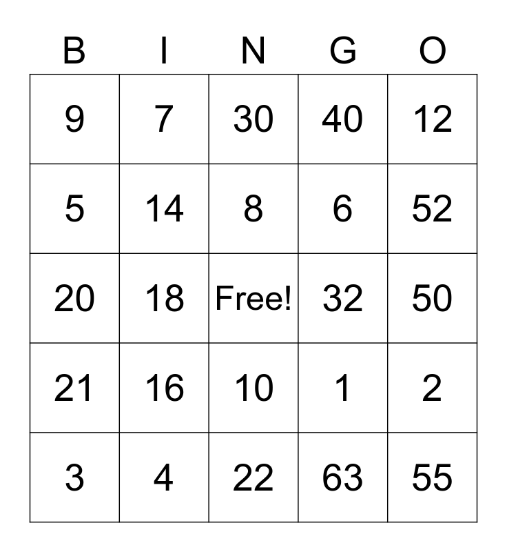 This bingo card has a free space and 24 words: 16, 4, 8, 3, 12, 9, 5, 7, 32, 10, 6, 20, 1, 2, 14, 63, 50, 30, 52, 18, 55, 21, 40 and 22.