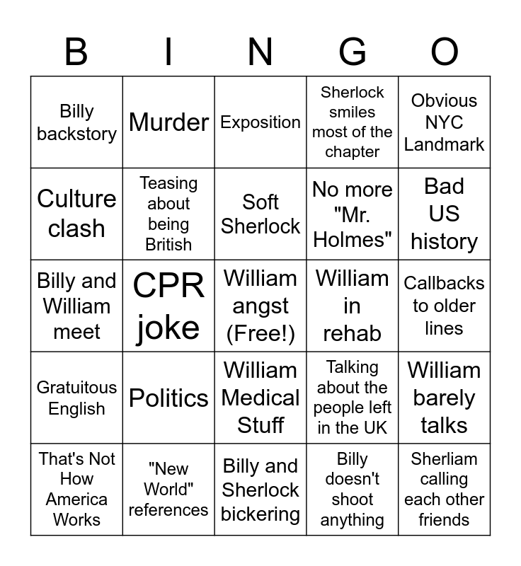 This bingo card has a free space and 24 words: Politics, "New World" references, Soft Sherlock, That's Not How America Works, Obvious NYC Landmark, Billy backstory, Culture clash, Murder, William in rehab, William Medical Stuff, No more "Mr. Holmes", Billy and William meet, Talking about the people left in the UK, William barely talks, Teasing about being British, Billy doesn't shoot anything, Callbacks to older lines, Exposition, Bad US history, CPR joke, Sherliam calling each other friends, Gratuitous English, Sherlock smiles most of the chapter and Billy and Sherlock bickering.