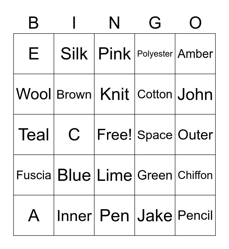 This bingo card has a free space and 29 words: A, B, C, D, E, Pink, Brown, Blue, Space, Inner, Outer, Pencil, Pen, Jake, John, Frank, Lime, Fuscia, Amber, Teal, Green, Fleece, Cotton, Wool, Polyester, Silk, Chiffon, Knit and Weave.