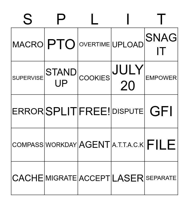 This bingo card has a free space and 30 words: MIGRATE, PAYPAL, SPLIT, GSD, MACRO, OVERTIME, STAND UP, AGENT, DISPUTE, ACCEPT, GFI, SEPARATE, LASER, BRIDGE, EMPOWER, EOC, A.T.T.A.C.K, COMPASS, WORKDAY, SNAG IT, ERROR, AAL, PTO, JULY 20, SUPERVISE, UPLOAD, FILE, CACHE, COOKIES and BOMGAR.