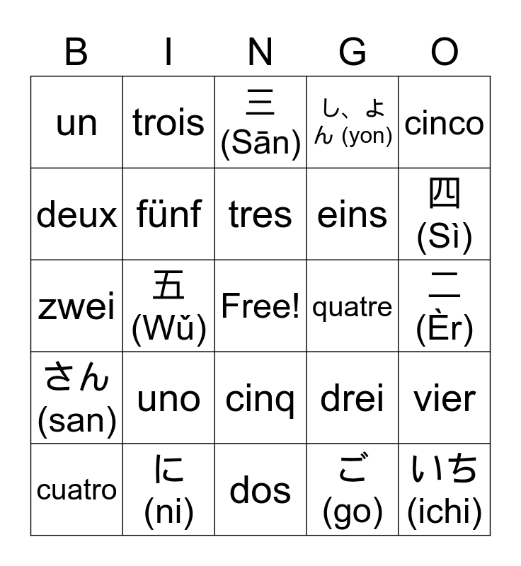 This bingo card has a free space and 25 words: uno, dos, tres, cuatro, cinco, un, deux, trois, quatre, cinq, eins, zwei, drei, vier, fünf, 一 (Yī), 二 (Èr), 三 (Sān), 四 (Sì), 五 (Wǔ), いち (ichi), に (ni), さん (san), し、よん (yon) and ご (go).
